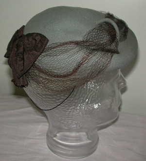 Naisten huovutettu päähine, joka on taitettu etureunastaan lippamaisesti kaksinkerroin. Somisteena reunassa nailonverkko, joka pysyy paikoillaan huopatuppiloista (2 kpl) tehdyillä kaarilla. Takana ripsisidoksellisesta nauhasta tehty ruskea ruusuke. Kiinnikkeenä kumilanka. Etuosassa valkoisia ja kellertäviä värjäytymiä.
