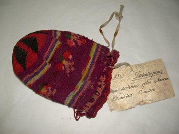 muotoon kirjovirkattu monivärinen tupakan säilyttämiseen tarkoitettu pussi, joka on vuoritettu vaaleanruskealla palttinasidoksisella kankaalla. Ulkoreunaan on virkattu pylväistä harvahko osuus, johon on todennäköisesti aikoinaan pujotettu kiristysnyöri. puuvillainen (tod. näk. myöhemmin lisätty) kiristysnauha on ommeltu pussi ulreunaan kiinni nauhan keskikohdalta. Pussin ulko- ja sisäpuolella paljon koinjätöksiä.Pussiin kiinitetty pahvilappu, jossa tekstino 251Topakspungfrån Auktion efter Änkan Lönnblad, Bemböle.