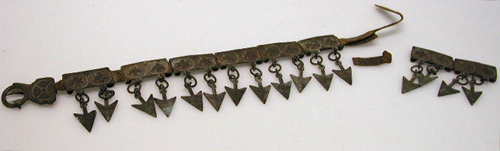 Heloilla varustettu nahkainen vyö. Helat on sirkkoja, jotka itse muodostavat silmukan. Sirkka on suorakaiteenmuotoinen kaksoiskuvionen messinkilevy, jossa kahdeksankulmion sisällä on tähti. Kapea nahkavyö kulkee messinkilevyn takana olevista lenkeistä. Sirkan alareunassa on kannatussilmukat, joista roikkuu kolmiomaisia riipuksia. Vyön toisessa päässä on jäljellä vyön lukon pää.