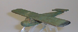 Kolmesta kappaleesta valmistettu, runko veistetty muotoon. Rungossa profiloitu etuikkuna ja nokka. Siivet kiinnitetty päälle naulaten. Etummainen siipi on jätetty maalamatta alapuolelta.