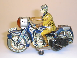 Sininen, vedettävä, pellistä valmistettu moottoripyörä, jonka päällä istuu pellistä valmistettu kellertävänruskeaksi maalatut vaatteet yllään. Tämän kädet on irtonaiset ja liikuttavat ohjaustankoa. Pyörän sivussa on vedettävä vieteri, joka ratasten kautta siirtyy pyörittämään takapyörää. Pyörän keskellä, erillisellä alustalla on tukipyörät.