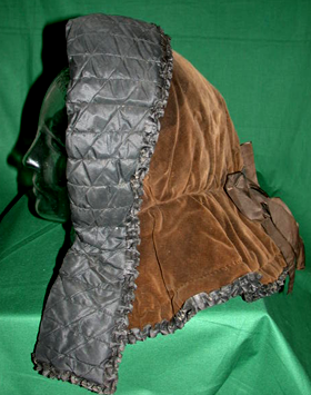 naisten samettipäällysteinen huppumainen päähine, jonka taaksepäin taittuva etureuna on konetikattua mustaa silkkiä. Taitteen reunassa on mustasta silkkiharsosta taiteltu falbolalaskosnauha, joka on ommeltu käsin reunaan.Taitteen nurja puoli on käsin tikattua violettia silkkikangasta, joka on reunastaa haalistunut. Huppuosa on päällyspuolelta ruskeaa samettia ja sisäpuolelta käsin tikattua mustaa silkkiä. Hupun reuna laskeutuu peittämään hartiat. Falbolalaskokset ulottuvat myös hupun alareunaan. Keskellä takana on koristeena ruskea silkkinauharuusuke. Päähine kiinnittyy edestä yhden metallihakasen avulla.