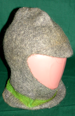 Käsin 1 oikein 1 nurin joustinneuleena neulottu kypärän alla käytetty alushuppu. Lanka on harmaata villaa ja alareunassa on 3 cm raita vihreällä langalla. Otsan kohdalle neulottu pieni lippamainen osuus. Takaosassa parsintaa harmaalla villalangalla.