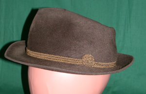 miesten lierireunainen nukattu huopahattu, jonka kuvun reunassa on kolme koristenyöriä. Näiden yhdistymiskohtaan on nyöristä kierretty nappimainen koriste. Kupu on kolmiomaiseen muotoon taiteltu. Eteen kolmion kulmaan on syntynyt kulumasta reikä.Vuoriosassa hikinauhaan merkitty reikämerkinnällä P.O.M sekä E.R.Wahlmann O/Y ImportFLE}CHET Made in France