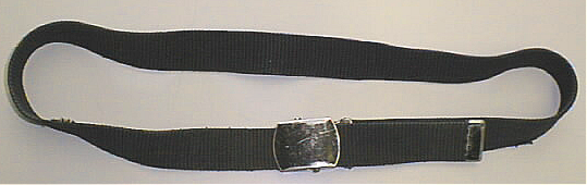 Kudottu musta puuvillainen vyö, jossa metallilevysolki. Vyön päässä metallilevyvahvike.