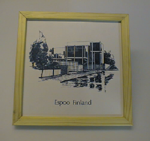 Neliskanttinen keraaminen laatta, johon on sinisellä painettu Espoon kulttuurikeskuksen kuva ja teksti: Espoo Finland. Ympärillä männystä tehdyt kapeat kehykset. Säilytys pahvisessa laatikossa. Ylätreunassa keskellä ripustamista varten tarkoitettu koukku.