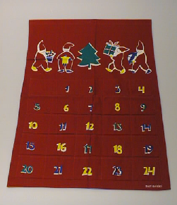 Suorakulmainen kangas, johon viidestä kangassuikaleesta on ommelten jaettu kuusi taskua viiteen riviin. Taskut on numeroitu 1-24, ensimmäinen tasku vasemmalla ylhäällä on numeroimaton. Ylhäällä on neljä tonttua lahjoja sylissään ja kuusi. Yläreunassa menee nauhakuja. Oikeaan alakulmaan on painettu tuotemerkki: marimekko.