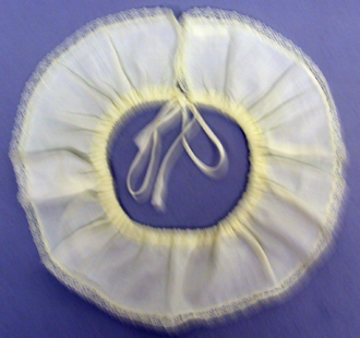 Irtokaulus on pyöreän muotoinen ja sen ulkoreunaa kiertää kapea pitsi. Se kiristetään sopivan kokoiseksi ja kiinnitetään kaulan ympäri nauhakujassa kulkevalla nyörillä.