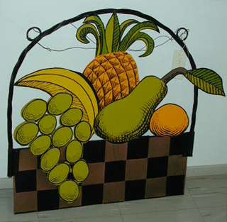 kyltin kehys on puoliympyrän muotoinen, joka on valmistettu kahdesta kierteelle taivutetusta takorautatangosta. Alareunassa on kolmessa rivissä mustia ja kuparin värisiä ruutuja. Kehyksen ja alareunan välissä on pellistä valmistettuja hedelmiä, viinirypäleitä, päärynä, ananas, appelsiini ja banani, jotka on maalattu vihreällä, keltaisella ja oranssilla. Kyhyksen yläreunassa on kaksi rengasta, joissa on rautalankaa kiinnitystä varten.