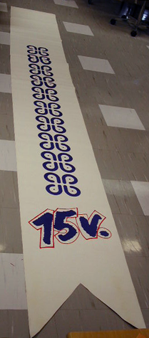 Pitkä ja kapea vahakankaasta valmistettu viiri, jonka alareuna on teräväkärkisten kolmioiden muotoinen. Viirin pohjaväri on valkoinen ja sen keskellä on jonossa kymmenen sinistä hannunvaakunaa. Alaosassa on sinisellä 15 v., jonka numerot on kehystetty punaisella. Samat tekstit ja kuviot molemmin puolin viiriä.