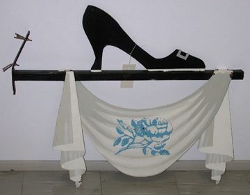 musta vaakasuora rautatanko, jonka päässä on kiinnityslevy. Tangon alareunasta roikkuu puolikaaren ja kaksi pisaran muotoista peltilevyä, jotka esittävät roikkuvaa kangasta. Se on maalattu valkoisesksi, jossa harmaalla varjostukset ja sinisellä maalattu ruusu. Tangon yläreunassa on pellistä valmistettu musta korkokenkä, jossa on hopean värinen solki ja valkoiset pohjat. Kiinnityslevyssä on kaksi mutteria paikoillaan.