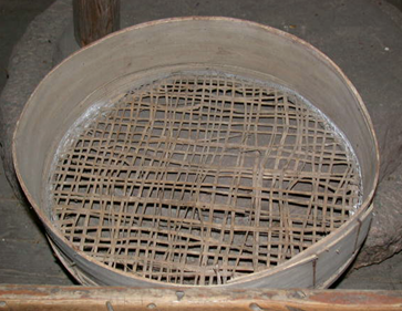 Puinen. Muodoltaan taipunut soikioksi. Laidat haapalastua, vakkatekniikalla taivutetut, liitetty yhteen kahvalla rautalankakoukulla. Pohja ohutta kapeaa puusyytä (kuoriainesta), joista punottu harva ristikko. Pohja liitetty laitojen ulkopuolelle ja päät sidottu erillisella laidan alareunaa vahvistavalla lastusuikaleella, joka naulattu laitoihin.