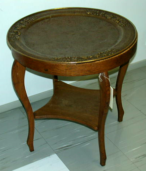 pyöreä pikkupöytä, jossa on päällä kuparilevy ja pieni alataso. Kuparilevyyn on kuvioitu peuroja ja tammenlehviä. Jalat ovat kaarevat.