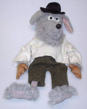 Harmaasta tekoturkisesta valmistettu koira jolla on valkoinen puuvillapaita ja vihreät huopahousut. Päässä on mustasta tekokuidusta vamistettu hattu. Koiran vartalo on pahvilevystä jonka pehmusteena on vanua. Raajat on puusta.