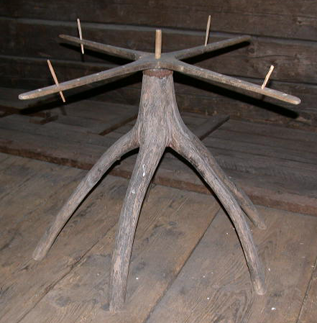 Jalkana luonnonpuu, jossa yhdestä varresta haarautuu viisi jalkaa. Jaloista yksi ollut poikki ja korjattu suurella rautanaulalla. Varren yläreuna tuettu kapealla rautavanteella, jotta eri puusta veistetty tappimainen kehän napa pysyisi paikallaan. Kehän muodostavat kaksi ristikkäin sijoitettavaa vartta joiden päissä 5-6 reikää siirrettäviä puikkoja varten. Kaikki puikot kuitenkin puuttuvat. Ollut maalattu mustaksi, väri kulunut.