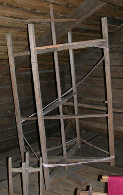 Puuta, maalaamaton. Keskellä on akselina toimiva napapuu, joka on kiinnitettynä sekä kattoon että lattiaan. Sen ympäri pyörii korkea pystyasentoon sijoitettu kehä, jonka kuvepuut ovat suorat, irti lattiasta ja katosta. Kuvepuita yhdistää sekä ylhäältä että alhaalta napapuun kautta kulkevat ristikkopuut, joita vielä on kaksi erillisenä kehikon keskellä. Kuvepuita yhdistää lisäksi kahden vierekkäisen puun välinen ns. reikäpuu, joka on tavallista lautaa ja jossa on kolme ulkonevaa pitkähköä puutappia loimilankojen sitomiseksi.
