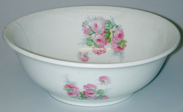 Valkoinen, sisäpuolella kolme naturalistista, vaaleanpunaista ruusurykelmää; ulkopinnalla samoin, mutta pienempinä. Kuviot sijaitsevat symmetrisesti, tasaisin välein. Ruusurykelmät ovat siirtokuvia. Astia on pyöreäpohjainen, joka levenee ylöspäin. Astian suu on myös pyöreä, joka kaartuu hieman ylöspäin. Astian sisäpohjassa paljon naarmuja ja reunassa kolhiumia.
