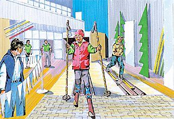 Vaakakuvana tussipiirustus hiiihtomuseon toimintaosastolta. Kuvassa etualalla sisälatu, jolla hiihtää punaliivinen tyttö sekä toista latua poika..vas.reunassa kolme katselijaa, joista etummainen liimattu kuvaan loppuvaiheessa.