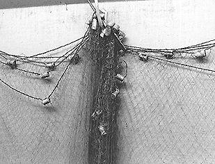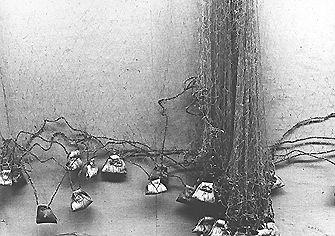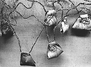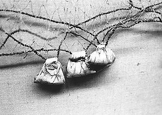 Suorakaiteen muotoinen, verkko kudottu pellavalangasta, koppikivekset tuohella päällystetty, kohot "pulloja" eli tuohikäpyjä