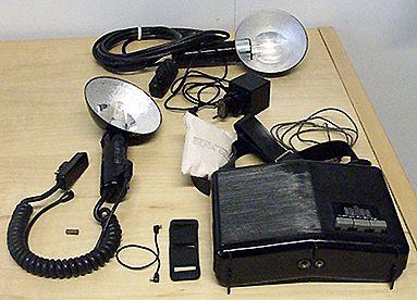 Heijastin, 2 kpl: halkaisijaltaan pyöreä varsi. Varren päässä pyöreä kupu. Kupu ulkopuolelta musta, sisältä kirkas ja heijastava. Sisällä salama. Toisessa pitkä johto. Akku: suorakaiteen muotoinen, litteä, keskeltä taitteinen. Matalat jalat. Edessä 3 harmaata nappulaa. Varustettu säädettävällä kantohihnalla. Takakansi avautuu. Sisällä patterit. Takana salaman tehon asetukset (110, 125, 160, 220, 250). Laturi: pieni, neliömäinen latauslaite akkujen latausta varten. Salamatäsmäysjohto: johto, jonka avulla salamalaite laukaistaan. Kiinnitetään kameraan. Säilytyslaukku: suorakaiteen muotoinen laukku. Kannen läpässä metallilukko. Sisällä tasku (pohja repeytynyt) ja nepillä kiristettävä avopohjainen lokero. Edessä kulmissa vetoketjulliset taskut. Varustettu kantohihnalla. Silikonigeelipussi: laukun sisällä silikonigeelillä täytetty pussi.