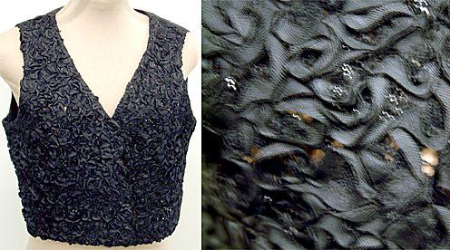 Vyötärömittainen, vartalonmyötäinen juhlaliivi. Etupuolella kangas koristeellinen, takaosa sileää. Pääntie v-mallinen. Edestä avoin.