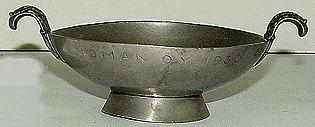 Laakea jalallinen malja. Päissä pienet kaarevat, lehtikoristeiset kädensijat.