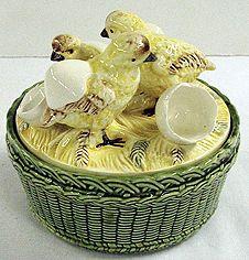 Halkaisijaltaan pyöreä kulho, jonka pinta jäljittelee punottua koria. Kannessa kolme juuri kuoriutunutta pääsiäistipua rikkonaisine munankuorineen.