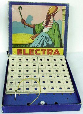 Laatikko: neliön muotoinen laatikko. Kanteen kuvattu egyptiläinen hallitsija sauva kädessään. Taustalla sfinksi ja pyramidi. Alhaalla kookkain punaisin kirjaimin teksti: ELECTRA. Kansi painetaan paikoilleen. Kannen sisäpuolella käyttöohjeet suomeksi ja ruotsiksi. Laatikon pohjaan kiinnitetty erillinen, pahvista tehty tila patteria varten. Kosketintaulu: laatikossa on irrallinen, neliön muotoinen kosketintaulu, jossa on 48 kpl pientä messinkinappia. Yläreunassa on pieni sähkölamppu. Siihen on kiinnitetty molemmin puolin keltaisen metallinarun varassa kaksi pitkää naulaa (toinen irronnut). Kosketintaulun toisella puolella on kukin metallinappi yhdistetty johonkin toiseen metallinappiin metallilangalla. Kysymys- ja vast. arkki, 7 kpl: rei"tetty kysymys- ja vastausarkki. Aihepiirit: Yhtä ja toista, Kirjallisuus, Keksijä-Löytäjä, Historia, Maantiede, 2 tyhjää arkkia omia kysymyksiä varten. Arkki asetetaan kosketintaulun päälle, niin että napit näkyvät rei"istä. Vasemmalla naulalla kosketetaan "kysymysnappia" ja luetaan kyseinen kysymys ja kosketetaan oikean vastauksen nappia toisella. Jos vastaus on oikea syttyy lamppu (paristokäyttöinen peli).