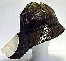 | museoesine: Päähine, naisen:sadehattu, sydvesti |