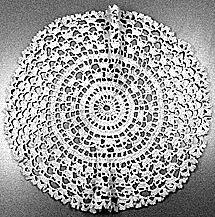 Pyöreä, nirkkoreunainen pylväin ja ketjusilmukoin virkattu pesukalustoliina.
