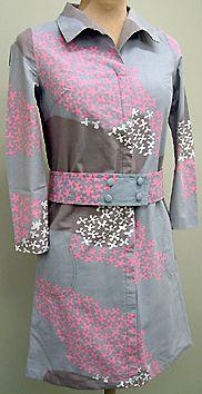 Pohjemittainen, vyötärösaumaton, suoralinjainen puku. Keskietusauman yläosaan upotettu vetoketju, pääntie pyöreä, siinä teräväkulmainen kaulus. Istutetut pitkät suorat hihat. Sivusaumoissa upotetut taskut, taskunpussi tikkattu etukappaleeseen. Irrallinen leveähkö vyö, jossa toisessa päässä 2 x 2 nappia, toisessa päässä kaksi napinläpeä