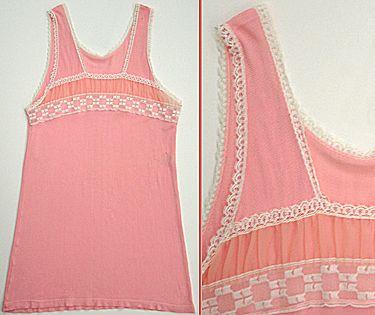 Lantion alapuolelle ulottuva tekokuituloimineuloksesta saumattu paita, jossa takaa yhtenäiset, edestä nailontylliin yhdistyvät olkaimet. Pääntie ja kädenaukot reunustettu kapealla nailonpitsinauhalla.