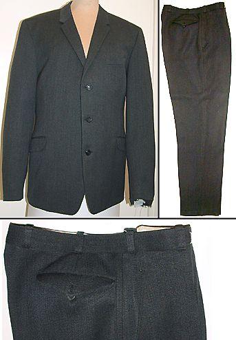 Takki: vartaloa loivasti myötäilevä puvun takki, jossa yksirivinen napitus. Kapeahko herrainkaulus, läpälliset upotetut taskut, rintatasku. Takaa suora, ei halkiota. Vuorissa povitaskut molemmin puolin, vasemmalla lisäksi kellotasku. Housut: suorat ja kapeahkolahkeiset housut. Viistosuiset upotetut taskut, takana läpälliset upotetut takataskut, vyötäröllä lisäksi pieni kellotasku. Edestä napeilla suljettava