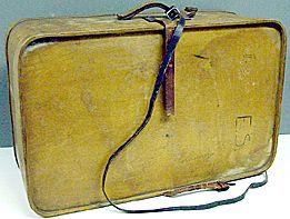 Suorakaiteen muotoinen matkalaukku, kulmat pyöristetty. Nahkainen kädensija. Pohjassa ja kannen reunassa vanerinen vahvike. Kansi irrallinen. Kannen kiinnityksessä käytettyä katkennutta nahkahihnaa korvaa nahkainen kapea vyö.