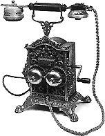 Puhelin, pöytäkone. Neljän valurautaisen käpäläjalan kannattama kaarevapäätteinen peltilaatikko, jonka etusivua koristaa lävistekoristeinen, kasviaiheinen valurautamaski ja siinä kaksi hälytyskelloa. Sivussa kampi. Harjalla haarukkaan vaakasuoraan asetettu kuuloke ja puhetorvi, joka yhdistyy koneeseen vihreän punotun nyörin avulla. Laatikko maalattu mustaksi, kullanvärinen kasviaiheinen koristelu. Valurautaosat **