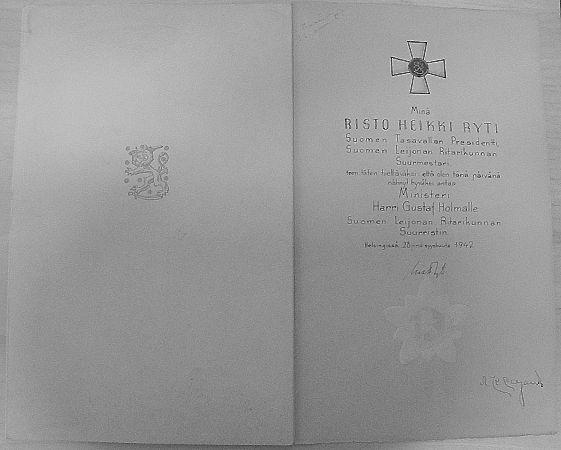 Suurristi olkanauhoineen: Yrjönristi, jonka keskellä Suomen leijona, nauha tummanpunainen muareekäsitelty. Risti kiinnitetty nauhaan metallilenkillä Rintatähti: Viisisakarainen tähti, keskellä pyörellä emaloidulla pohjalla Suomen leijona. Takana neulakiinnitys Omistuskirja: irtokannet pahvia, etukannessa kullanvärinen Suomen Leijona. Kunniakirja 2-sivuinen paperiarkki (vesileima Tervakoski 1940) Kotelo: Suorakaiteen muotoinen, kannellinen kotelo, jossa saranat ja lukitushela. Sisälle koteloon muotoiltu paikat suurristille, nauhalle ja tähdelle.