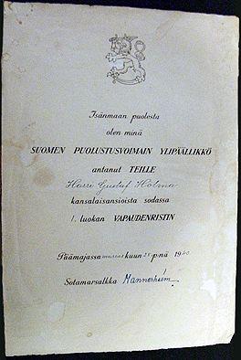 | museoesine: Kunniamerkki:Vapaudenristin 1. luokka kansalaisansioista sodassa |