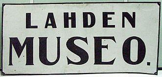 Suorakaiteen muotoinen kyltti, jossa valkoisella pohjalla teksti: LAHDEN / MUSEO. Museo-sana kookkaammilla kirjaimilla kuin sana Lahden. Kyltin reuna musta. Kyltissä reiät kiinnitystä varten.