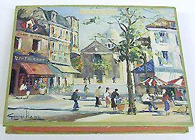 Suorakaiteen muotoinen suklaarasia. Pohjan reuna ulkoneva, samoin kannen. Kannessa katunäkymä Pariisista.