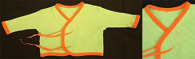 Vauvan pitkähihainen kietaisumallinen joustinneulospaita, jossa etukappaleet menevät päällekäin ja alle jäävä kappale solmitaan kainalosta nauhoin. Päällikappale solmitaan kaksin nauhoin. Reunat kantatut trikoolla.