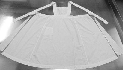 Ohutta valkoista puuvillapalttinaa. Helmaosa ommeltu 3 kappaleesta, saumat sivuilla. Helmaosa lievästi poimutettu ylhäältä. Oikealla edessä päälitasku. Rintatilkku on poimutettu alhaalta Olkaimet kiinnittyvät edessä vyötärökaitaleeseen ja sivuilta rintatilkkuun, takana nappikiinnitys. Vyötärökaitale jatkuu solmiamisnauhoina, jotka levenevät päihin päin.