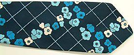 Leveä polyesterisolmio, jossa molemmissa päissä vaaleansininen tekokuitupalttina vuori. Tummansinisellä pohjalla viivaruudukko ja tyyliteltyjä kukkia
