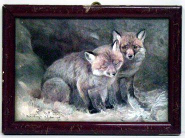 Kehystetty painokuva,joka esittää kahta kettua.viininpunaiseksi maalatut puukehykset.päällä lasi.takana taustapahvi,reunoissa liimapaperit.yläreunassa pyöreä messinkinen ripustin.