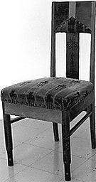 Istuin ja hartialaudan alaosa pehmustettu ja verhoiltu. Etujalat sorvatut, suorat, alapää kapeampi metalliholkillinen. Takajalat nelikulmaiset, jatkuvat kapeahkon selustan tukipuina. Korkea hartialauta, jossa keskellä upotettu pystylista. Suorassa selkälaudassa reliefileikkaus kuten pöydässä (:4). Sarja suora,upotettu etujalkojen sisään. Sivuilla ohuet pienat, jotka kiinnittyvät sarjaan kahdella pystypienalla.*