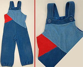 Pienen lapsen froteneuloksesta saumattu lappuhaalari. Takana vyötäröllä kuminauha, yläselästä lähtee eteen kiinnitettävät olkaimet, joissa napit. Lahkeiden suussa kuminauha.