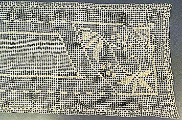 Suurehko suorakaiteen muotoinen harvahko virkattu liina. Keskellä iso suunnikas, päissä symmetriset rajatut kukka- ja lehtikuviot.