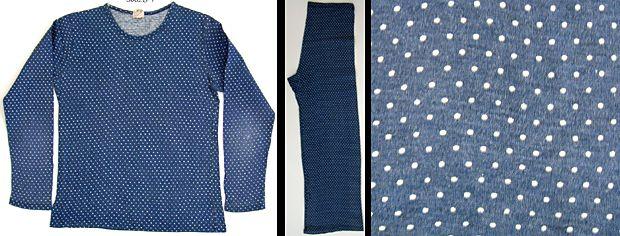 Paita: Lapsen pyjaman paita puuvillamodaalia,kudeneulosta.Sinisellä pohjalla pieniä valkeita palloja.Pitkät hihat,pyöreä pääntie. Housut: Lapsen pyjaman housut puuvillamodaalia,kudeneulosta.Sinisellä pohjalla pieniä valkeita palloja.Pitkät suorat lahkeet.Vyötäröllä kuminauha.