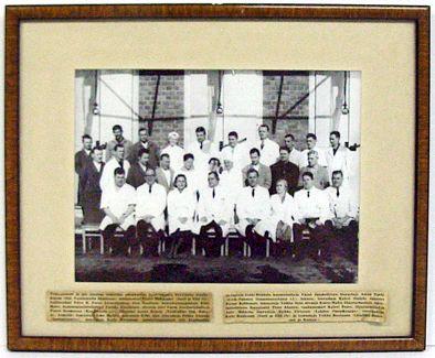 Suorakaiteen muotoinen kehystetty valokuvataulu.mustavalkoinen vaakavalokuva Lahden kaupunginteurastamon ja sen suojissa toimivien asiakkaiden henkilökunnasta.vaalea paspartour.päällä lasi.puukehykset,joiden sivut maalattu mustiksi,päällys vaaleanruskea mustin raidoin.taustapahvi ruskea,reunoissa liimapaperit.takana keskellä kolmionmuotoinen metalliripustin.lasiin liimattu samnomalehdestä leikattu kuvateksti.