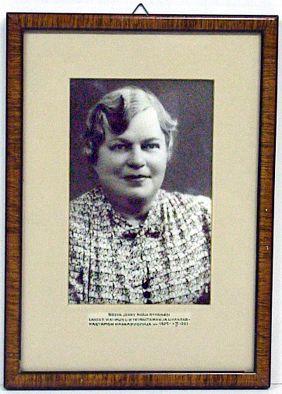 Suorakaiteen muotoinen kehystetty valokuvataulu.mustavalkoinen pystyvalokuva rouva Jenny Maria Ryhäsestä.vaalea paspartour.päällä lasi.puukehykset,joiden sivut maalattu mustiksi,päällys vaaleanruskea mustin raidoin.taustapahvi ruskea,reunoissa liimapaperit.takana keskellä kolmionmuotoinen metalliripustin.kuvan alapuolelle paspartouriin liimattu kuvateksti.