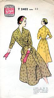 Kaavat: Naisen vierailupuvun kaavat koko 42. Mallipiirros: Naisen vierailupuvun mallipiirros.Vyötäröltä tiukka,hulmuavahelmainen.Kimonohihainen,pitkät,kapeat hihat. Leikkuu- ja ompeluohjeet: Naisen vierailupuvun leikkuu- ja ompeluohjeet.